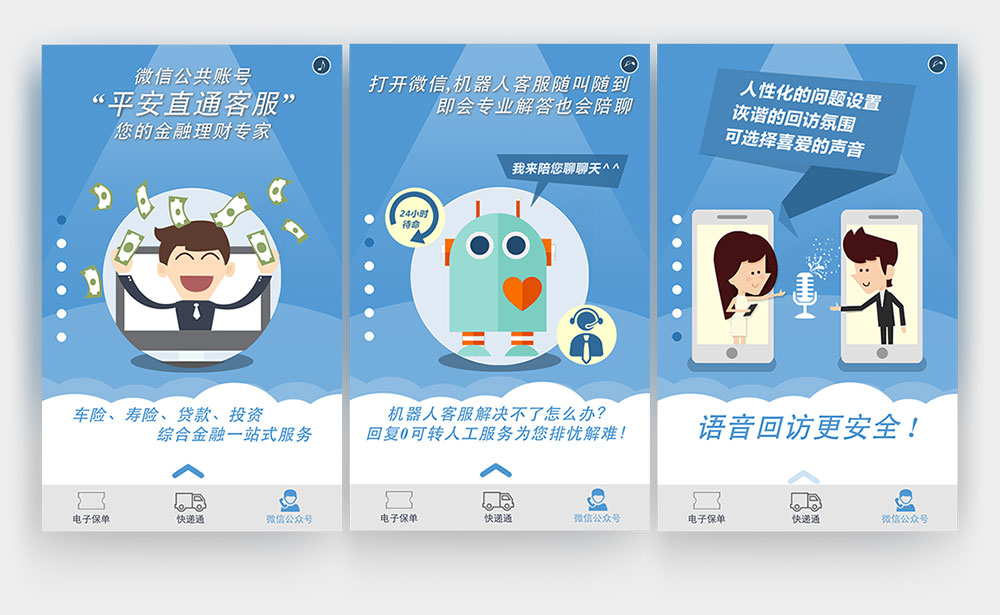 平安直通客服是平安直通保險公眾賬號內,介紹平安直通客服的H5手機端頁面。邁若從項目人群及瀏覽習慣出發,以輕松的卡通形象配合幽默風趣的文字,讓瀏覽者快速、便捷的了解平安直通客服的功能及介紹。