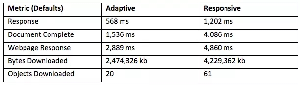 然而,如果客戶和公司存在預算,自適應設計可能是更好的選擇。根據Catchpoint進行的一個測試,他們在Wordpress創建兩個網站,一個使用標準的WPTwentyFourteen響應式主題,另一個使用一個名為Wiziapp的插件。
