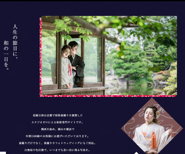 Wasoumaedori一家提供日式和服婚紗以及拍攝的公司,網站的整體用色創新大膽,一眼就讓人
